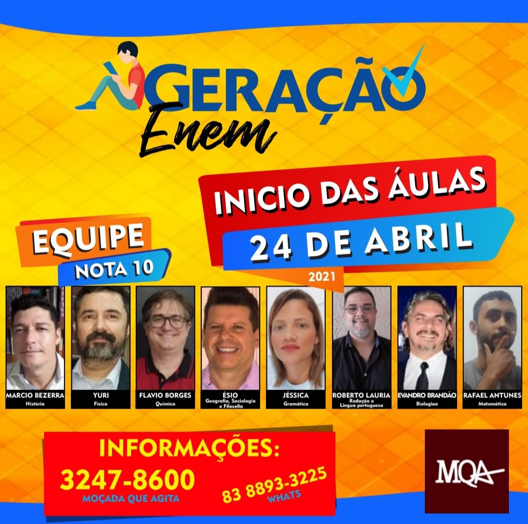 À partir do dia 24 de abril o cursinho Geração Enem iniciará suas aulas de forma híbrida nós turnos da tarde e noite, caso essa modalidade se mostre segura para todos. Isso tudo de acordo com as novas normas de convivência, impostas pelo Governo. À partir de setembro, pretendemos realizar grandes aulões em vários bairros de João Pessoa, aproximando o conhecimento dos alunos mais carentes e dessa forma contribuindo de maneira social para ajudar nossos jovens a ingressarem com mais facilidade no ensino superior.