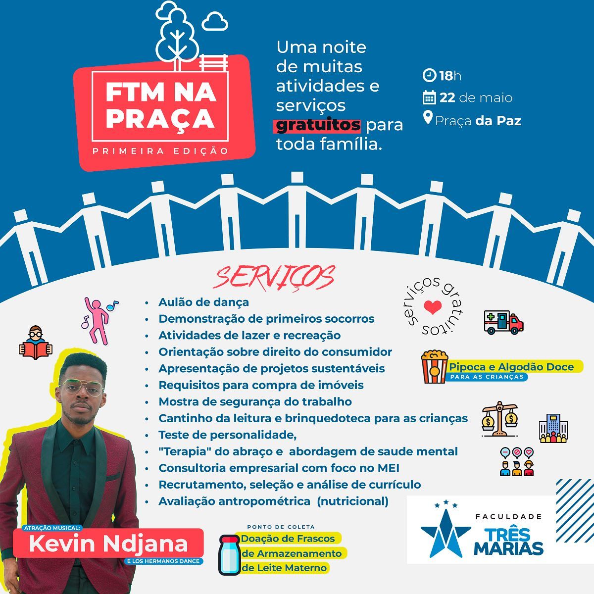 A Faculdade Três Marias realiza nesta quarta-feira (22), a partir das 18h, na Praça da Paz, a primeira edição do projeto FTM na Praça. A iniciativa tem o objetivo de oferecer atividades e serviços gratuitos para a população, com a participação dos alunos e professores. Além das ações, o FTM na Praça terá a apresentação do cantor Kevin Ndjana.