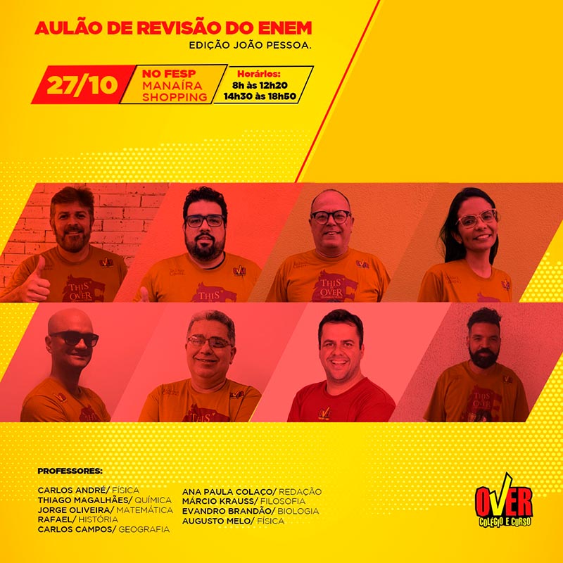 No dia 27, A Fesp Faculdades e o Over Colégio e Curso irão realizar um mega aulão de revisão para o Enem, com os melhores professores do Rio Grande do Norte e Paraíba. O aulão será aberto ao público e terá início às 8h.