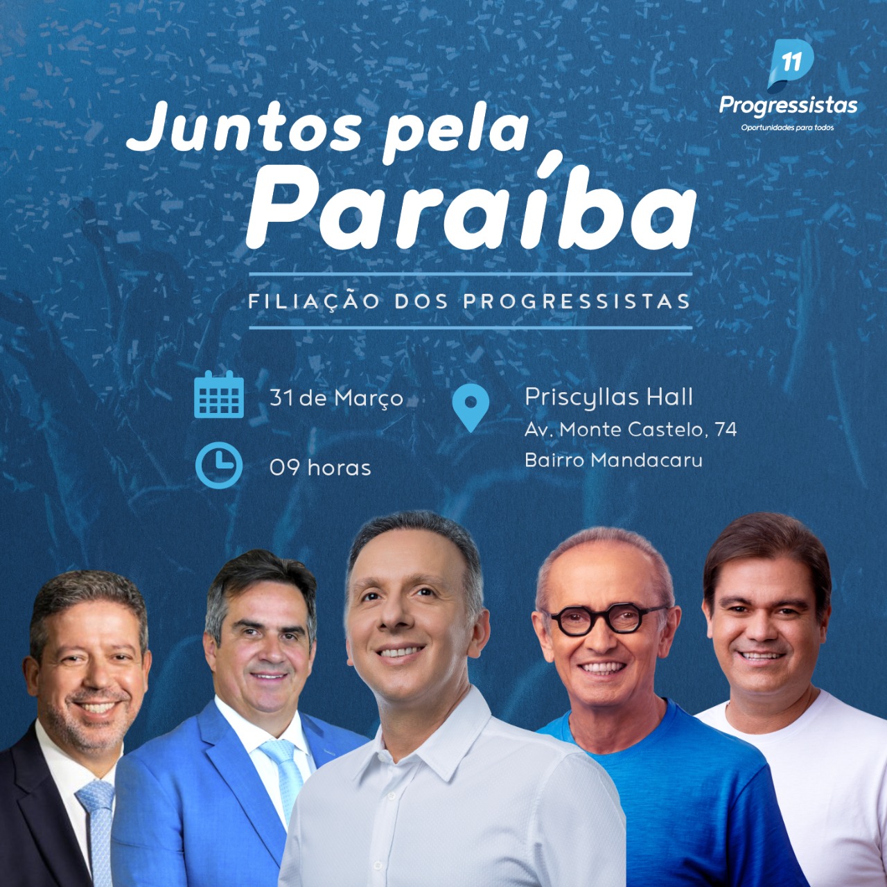 Na arte divulgada pelo PP, só há imagem de homens: o deputado federal Aguinaldo Ribeiro, pré-candidato ao Senado; o prefeito da Capital, Cícero Lucena; o vice-prefeito de Cabedelo, Mersinho Lucena; o presidente nacional do partido, ministro Ciro Nogueira, e o presidente da Câmara Federal, Arthur Lira.