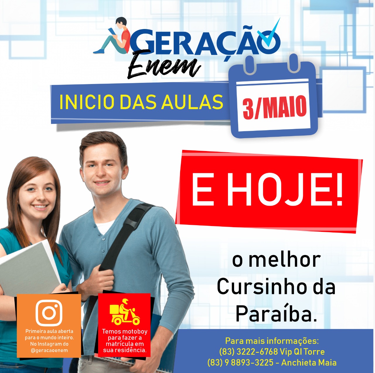 Hoje acontecerá a primeira aula do Cursinho Geração Enem. Inicialmente serão aulas online, devido a Pandemia.