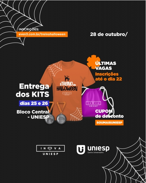 Os kits da 2ª edição do Treino de Halloween INOVA UNIESP serão entregues nos dias 25 e 26 de outubro, respectivamente segunda e terça, no Bloco Central da instituição. A corrida, com um percurso de 5km, será realizada na quinta (28), com concentração marcada para as 18h e larga as 19h. Para se inscrever, basta acessar o site: www.even3.com.br/treinohalloween/.