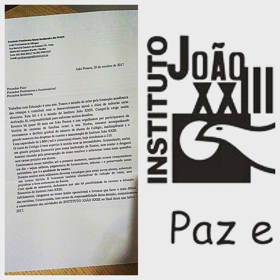 Em nota, a direção do instituto JOÃO XIII informou aos pais sobre encerramento das atividades educacionais para 2018. Foram mais de 60 anos formando grandes profissionais, ensinando ética, condutas entre outros. na carta entregue aos pais é citado a questão financeira, ou seja inadimplência. Fica aqui nossos sentimentos a todos os pais, à equipe de professores, coordenadores e direção.