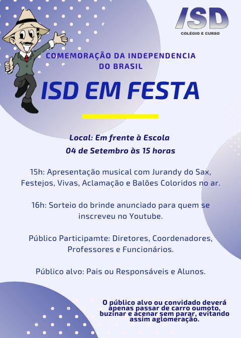 No dia 4 de setembro, às 15:00, O Colégio Santos Dumont irá comemorar a independência do Brasil. O evento irá contar co a presença dos diretores, coordenadores, professores e funcionários da instituição. Os alunos com seus pais, deveram passar pela frente da escola, em veículos automotor, buzinar e acenar, evitando aglomeração. A comemoração terá a apresentação musical de Jurandy do sax, sorteio e brindes.