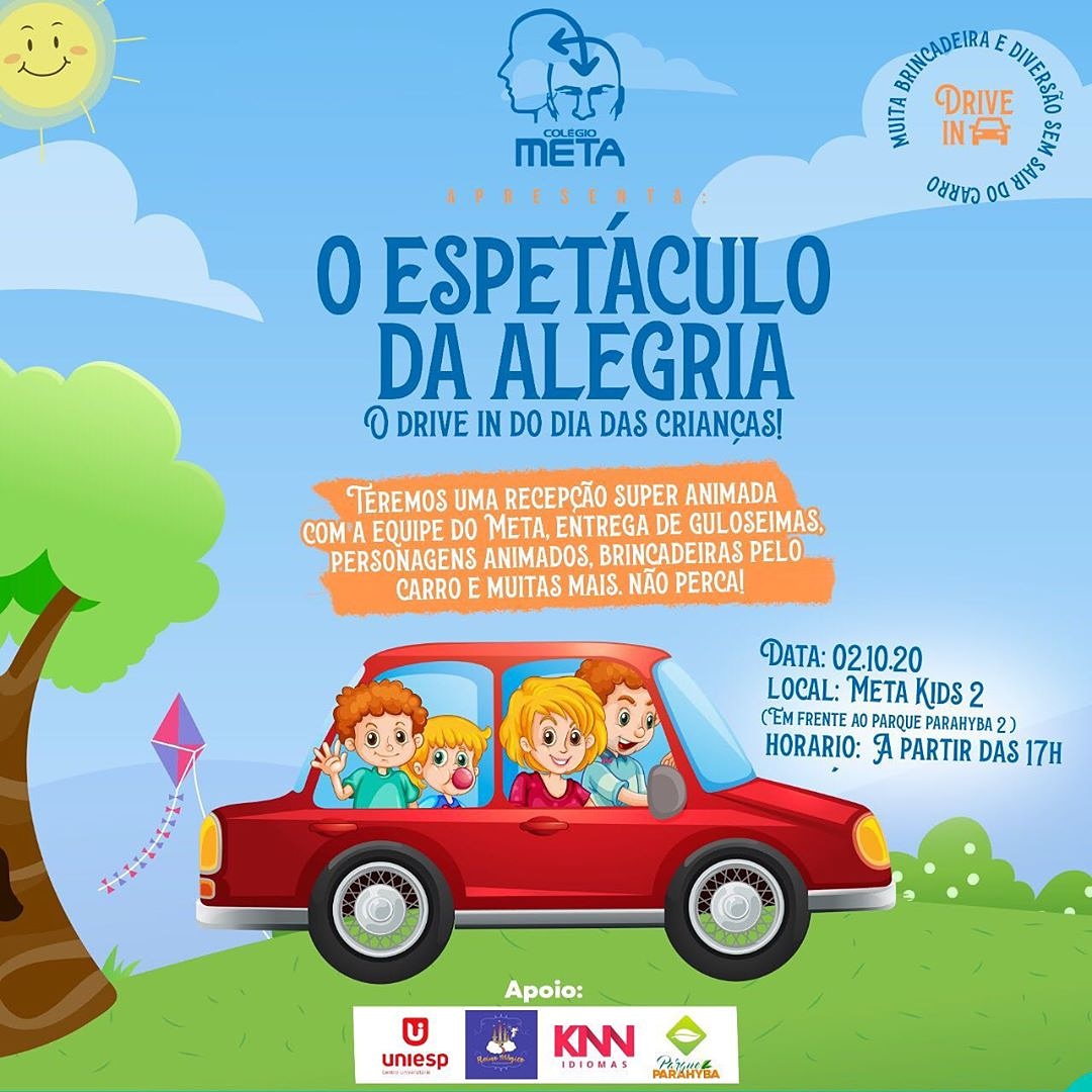 E hoje às 17h o Colégio Meta irá realizar um Drive in do dia das crianças. Terá bastante atrações e brincadeiras. O local será no Meta Kids 2, em frente ao parque Parahyba 2.